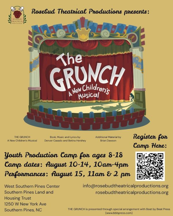 Rosebud Theatrical Productions is hosting a Youth Production Camp featuring The Grunch: A New Children’s Musical, which was written by Denver Casado and Betina Hershey with additional material by Brian Dawson. This creative opportunity is open to young performers ages 8-18 and will take place at the West Southern Pines Center at the Southern Pines Land and Housing Trust.