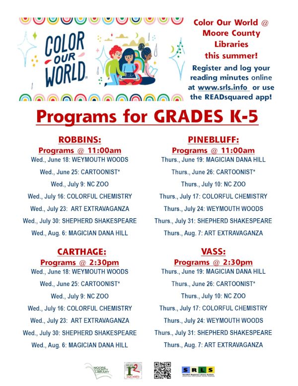 | Color Our World Summer Program | Exciting weekly programs. (summer through 8/7/25) | 2:30pm | K-5 | Moore Co Library | Carthage, NC |