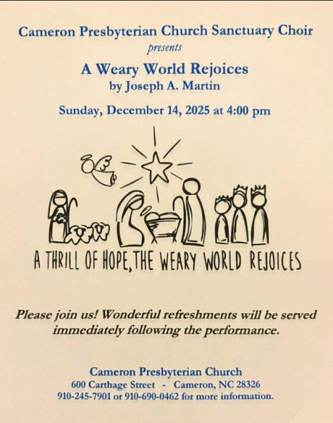 The Cameron Presbyterian Church Sanctuary Choir presents “A Weary World Rejoices” by Joseph A. Martin on Sunday, December 14th, 2025 at 4:00pm. A thrill of hope, the weary world rejoices. Wonderful refreshments will be served immediately following the performance. The church is located at 600 Carthage Street in Cameron. For more information, please call 910-245-7901 or 910-690-0462.