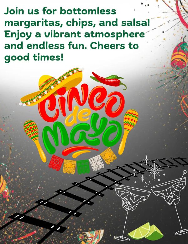 Engine Room 87: Cinco De Mayo. This Cinco de Mayo: hot grills, cold drinks, and a fiesta on the E87. Step aboard a one-of-a-kind celebration! Our restored locomotive transforms into a self-pour bar with rooftop seating, a cozy panoramic caboose, and an adults-only vibe. Pour your favorites from 20 self-serve taps featuring cerveza, wine, and seltzer all night long—or let our bartender keep the party flowing with margaritas. With lively music and themed costumes, this is Cinco de Mayo like you’ve never experienced before. All aboard for pour & fiesta!