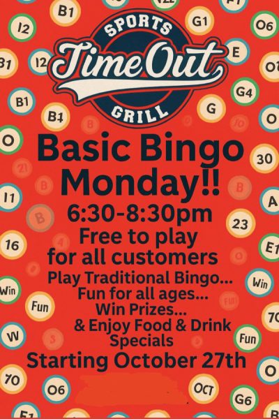 Calling all Bingo Fans! Get ready for a night of Basic Bingo at Time Out Sports Grill! The fun takes place every Monday from 6:30pm-8:30pm. This is a casual and relaxed evening of traditional bingo that is free to play for all customers and fun for the whole family, with all ages welcome. You can win prizes and spins every Monday while enjoying the available food and drink specials.