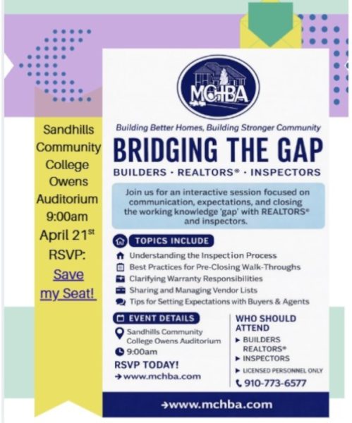 The Moore County Home Builders Association is hosting an interactive session titled Bridging the Gap for Builders, Realtors, and Inspectors on April 21st, from 9AM-12PM. This event takes place at the Sandhills Community College Owens Auditorium and is designed to improve communication and close the working knowledge gap between industry professionals.