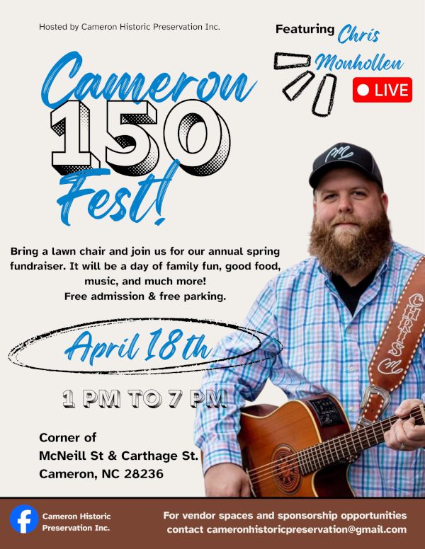 Join as Cameron Historic Preservation, Inc. presents the 2026 Cameron 150 Fest! The festival takes place on Saturday, April 18th, from 1PM-7PM in historic downtown Cameron. Grab a lawn chair, bring a friend and join for a special edition of the annual spring fundraiser. Enjoy a day of family fun, good food, and music featuring Chris Monhollen LIVE, so remember to bring a lawn chair to enjoy the festivities. There is free admission and free parking for all guests, and those interested in vendor spaces and sponsorship opportunities can contact cameronhistoricpreservation@gmail.com.