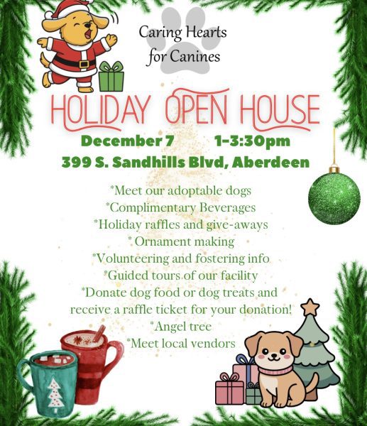 Come visit Caring Hearts for Canines as they open our doors and welcome the community in to learn more about who we are! Join on Saturday, December 7th, from 1:00pm-3:30pm for their Holiday Open House at 399 S. Sandhills Blvd, Aberdeen. A celebration of 5,000 dogs and puppies saved! Come meet the adoptable dogs and enjoy complimentary beverages. The event will feature holiday raffles and give-aways, ornament making, and guided tours of the facility. You can also get information on volunteering and fostering. Meet local vendors and see the Angel Tree. You can receive a raffle ticket for your donation of dog food or dog treats!
