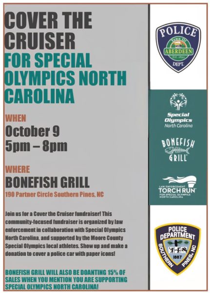 Join the Aberdeen and Southern Pines Police Departments for the Cover the Cruiser Fundraiser supporting Special Olympics North Carolina. The event is happening tonight, October 9th, 5pm-8pm, at the Bonefish Grill located in Southern Pines. Show up, make a donation to cover a police car with paper icons, and help local Special Olympics athletes! Bonefish Grill will also donate 15% of sales when you mention you are supporting Special Olympics North Carolina!