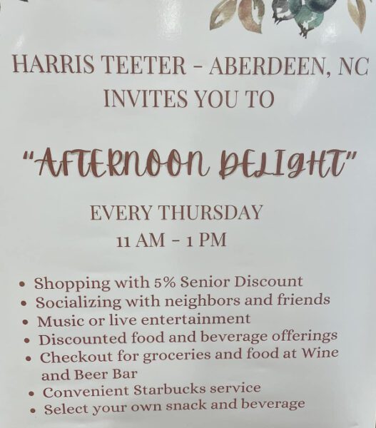 Come out to Harris Teeter in Aberdeen and enjoy live music as part of the “Afternoon Delight” program. This program highlights food discounts, special snacks and a chance to have a glass of wine or cold beer with your friends while enjoying music!