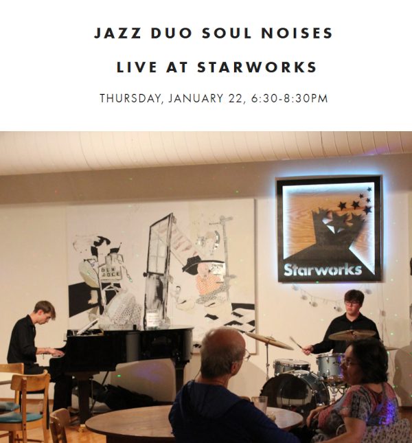 Enjoy live music at Starworks Cafe & Taproom on Thursday, January 22nd! Jazz Duo Soul Noises will be performing from 6:30pm-8:30pm.