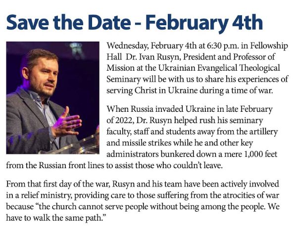 Join at Community Presbyterian Church in Pinehurst for a powerful evening with Dr. Ivan Rusyn, President of the Ukrainian Evangelical Theological Seminary of Kyiv, as he visits the Fellowship Hall on Wednesday, February 4th, from 6:30pm-8:00pm. Dr. Rusyn will share his firsthand experience leading relief ministries and providing spiritual care to those on the front lines since the 2022 invasion, illustrating how the church has become a central pillar of healing for a wounded nation. This community event will conclude with a dedicated question-and-answer session followed by a free-will offering to support ongoing relief efforts in Ukraine.