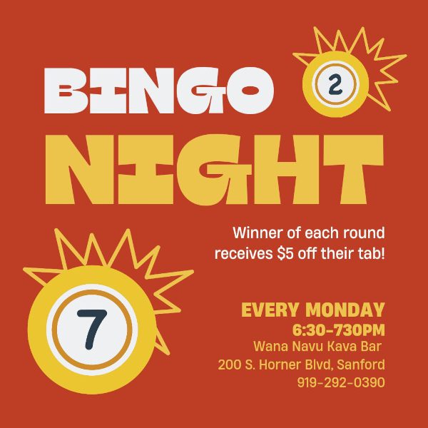 Join for Bingo Night at Wana Navu Kava Bar every Monday evening from 6:30pm-7:30pm. Start your week with some friendly competition! Whether you are a bingo pro or just looking for a fun night out, join for your chance to win and enjoy the community atmosphere. The winner of each round receives $5 off their tab.