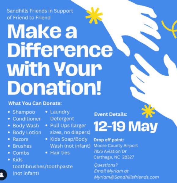 Sandhills Friends is hosting a donation drive in support of Friend to Friend from May 12th-May 19th. Community members are encouraged to donate personal care items such as shampoo, conditioner, body wash, lotion, razors, brushes, combs, laundry detergent and hair ties. Donations of children’s items are also welcome, including kids’ soap and body wash (not for infants), pull-ups (larger sizes) and toothbrushes with toothpaste. Make a difference with your donation! The drop-off point is the Moore County Airport. For more information, contact Myriam at Myriam@Sandhillsfriends.com.