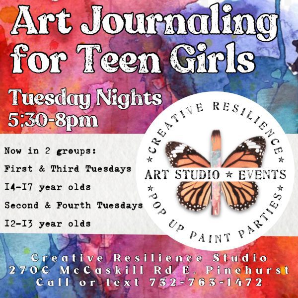 Empower your creativity this season at the Teen Girls Art Journal sessions hosted by Let’s Paint the Town at the Creative Resilience Studio in Pinehurst! These workshops take place on Tuesday evenings from 5:30pm-8:00pm. with age groups alternating each week: