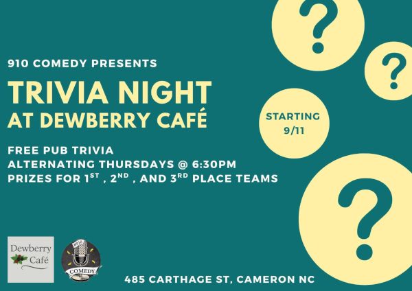 Test your knowledge at Trivia Thursdays with 910 Comedy at Old Hardware Vintage Depot & Dewberry Café in Cameron! Starting September 11th, join every other Thursday at 6:00pm for a fun and competitive evening. Bring your crew, play for bragging rights and see if you can snag 1st, 2nd, or 3rd place prizes!