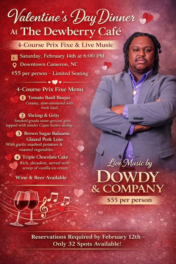 The Dewberry Café in Downtown Cameron is hosting a special Valentine’s Day Dinner on Saturday, February 14th at 6:00pm featuring a 4-Course Prix Fixe and live music by Dowdy & Company. For $55 per person, guests can enjoy a menu of Tomato Basil Bisque, Shrimp & Grits, Brown Sugar Balsamic Glazed Pork Loin, and Triple Chocolate Cake, with wine and beer also available. Seating is limited to only 32 spots, and reservations are required by February 12th.